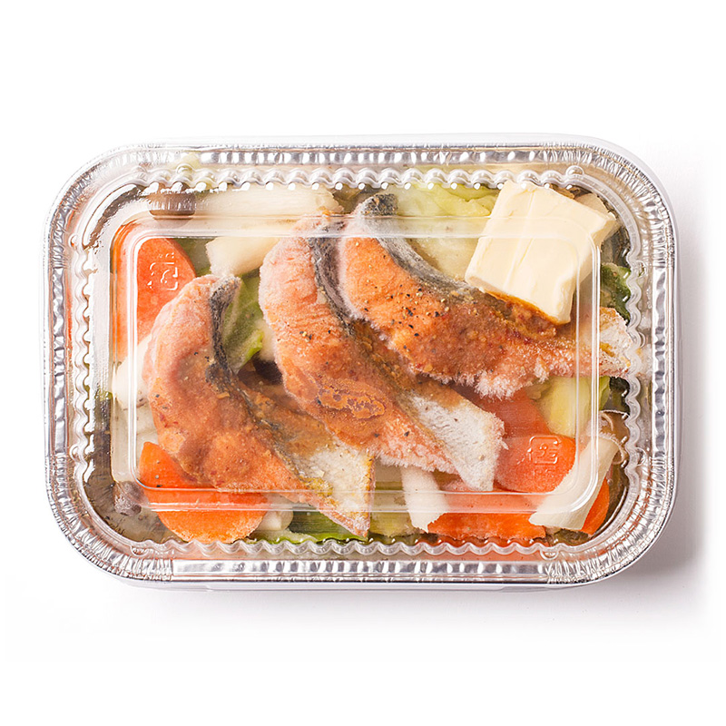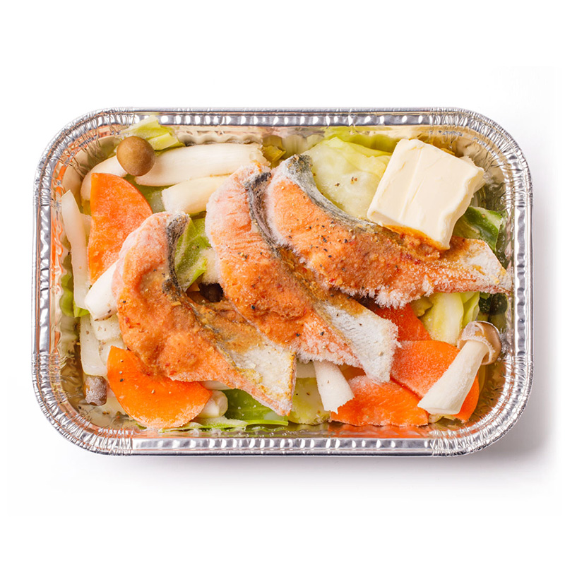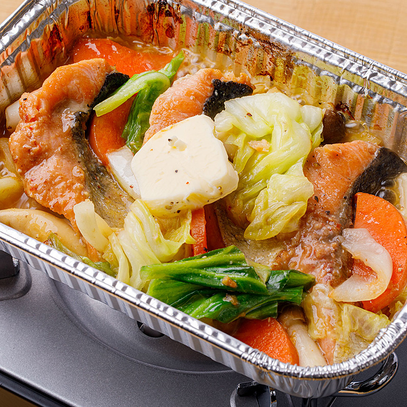 男鹿産のサケをつかって、北海道の名物料理ちゃんちゃん焼きをアルミ使い捨て容器で一人前サイズに仕立てた、ご自宅でのボッチ飲みやソロキャンプ・ソロ車中泊のお供。