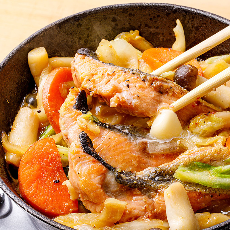 業販・仕入のご相談はこちら| 原材料 | さけ(秋田県産)、キャベツ、たまねぎ、にんじん、しめじ、バター、米みそ、米油、清酒、みりん、三温糖、豆板醤、しょうが、和風だしの素、(一部にさけ・小麦・大豆・乳成分を含む) |