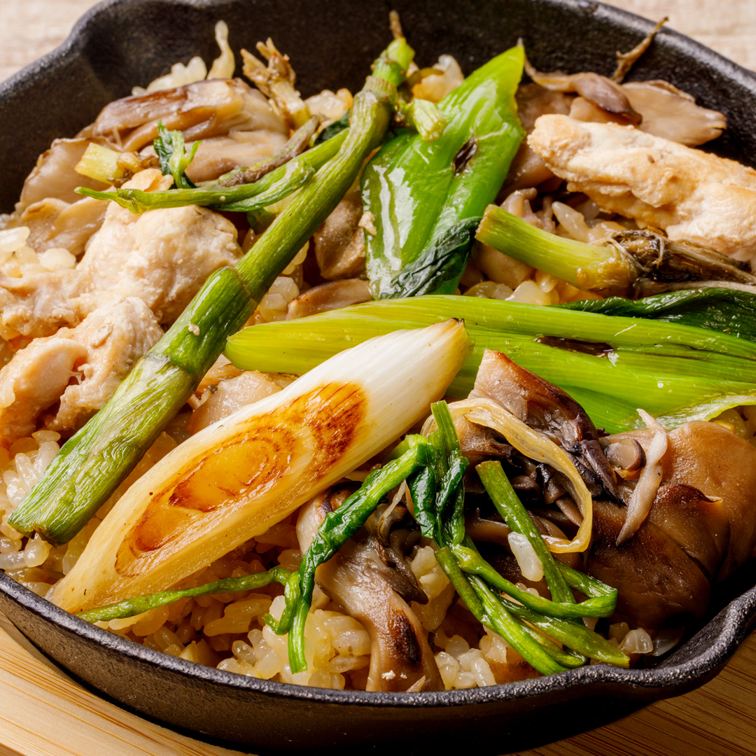 化学調味料不使用の比内地鶏スープをつかった秋田名物きりたんぽ風味のパエリア!比内地鶏やまいたけ、セリなど具材も本格仕様!