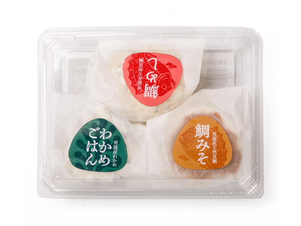 男鹿産天然真鯛のほぐし身をふんだんに使った「特製鯛みそ焼きおにぎり」と「鯛めしおにぎり」。そして男鹿産わかめを混ぜ込んだ「わかめごはんおにぎり」。ごはんはもちろん男鹿産あきたこまち!男鹿の恵みをつかってつくった男鹿ならではの冷凍おにぎりです。
